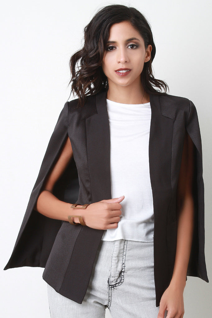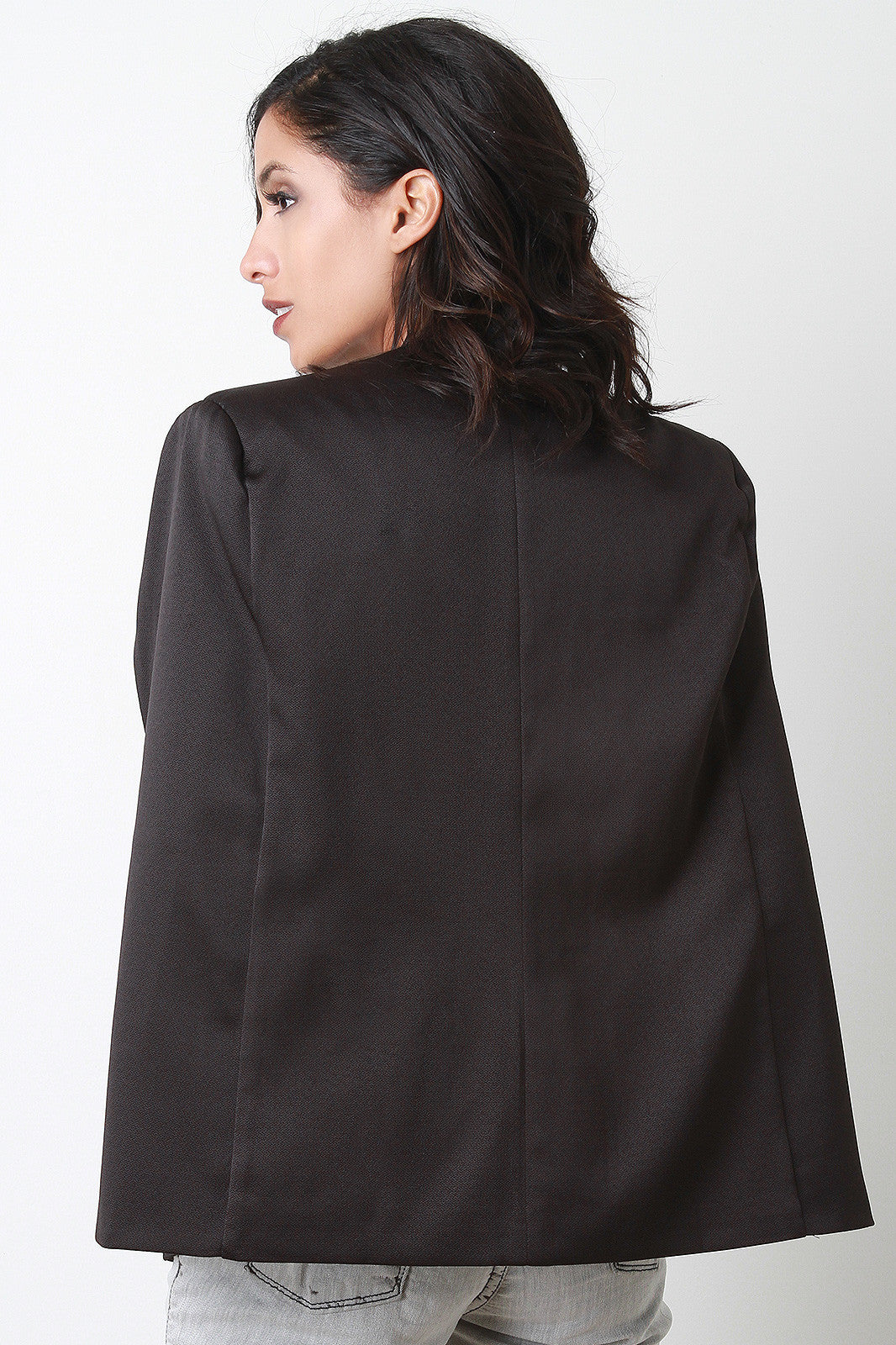This blazer jacket features a cape style sleeve opening, open front, double texture knit fabrication, strategically place seams, and fully lined. Accessory sold separately. 100% Polyester.