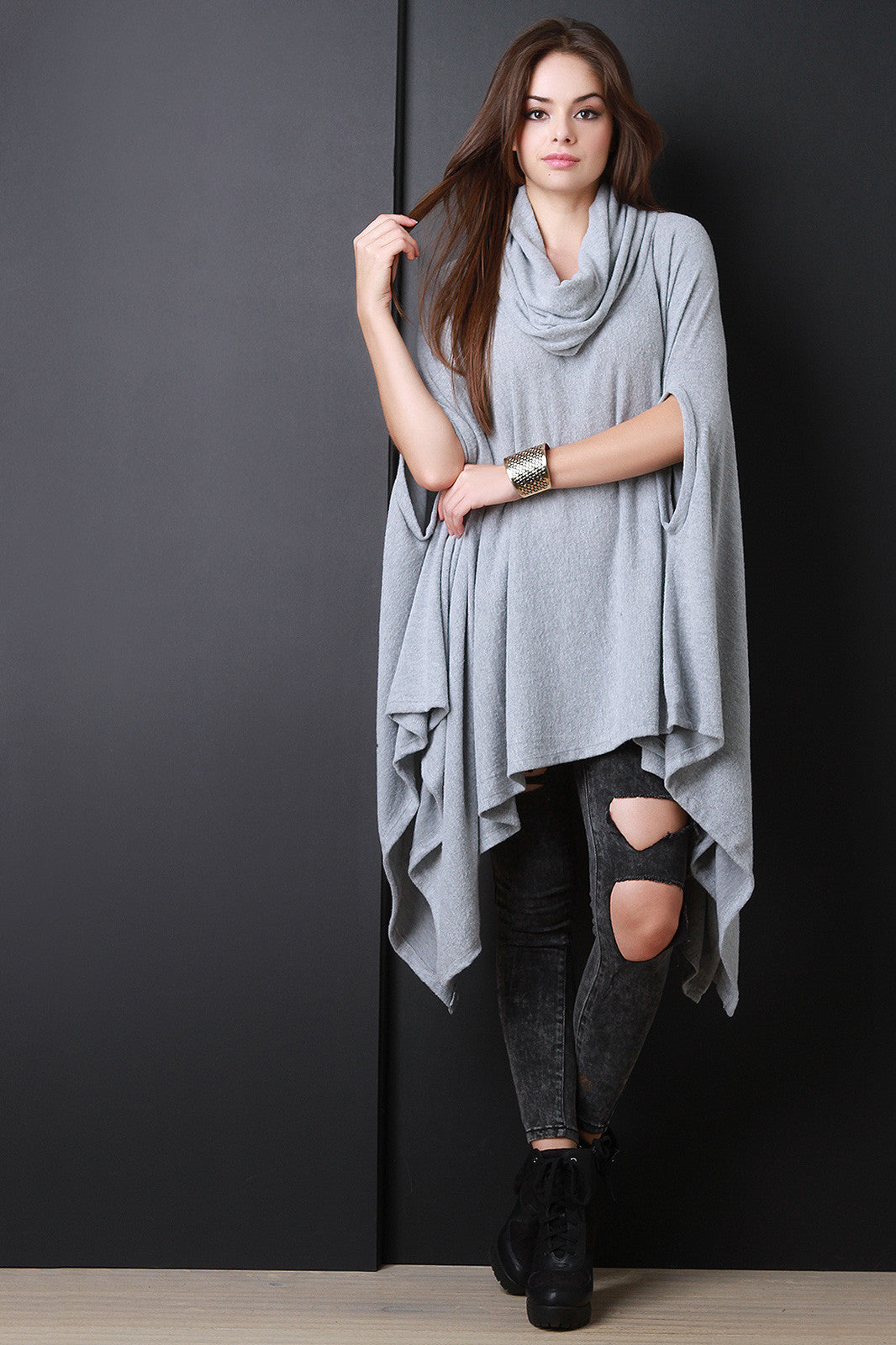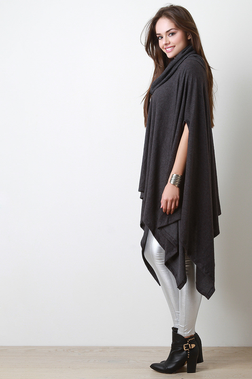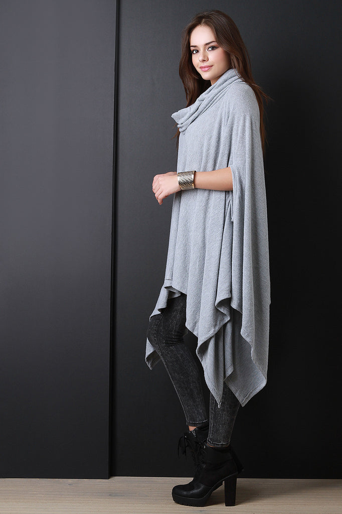 Cowl Neck Handkerchief Knit Poncho Maxi Top
