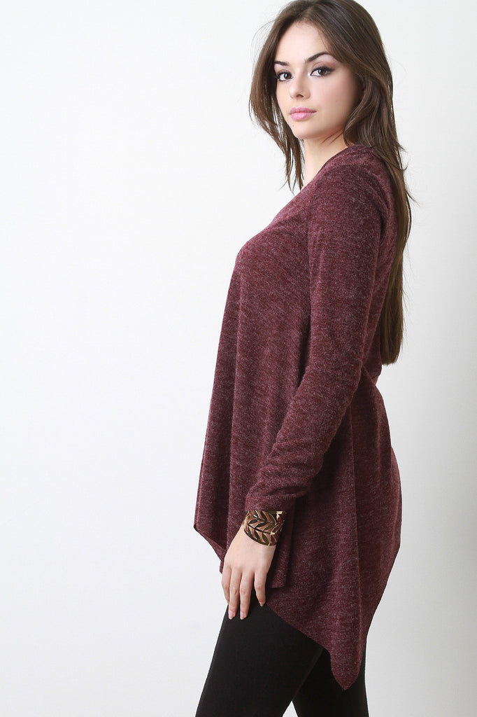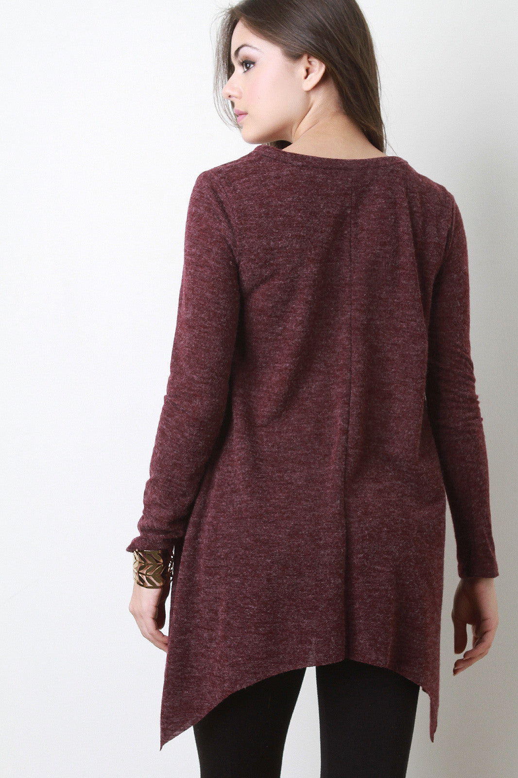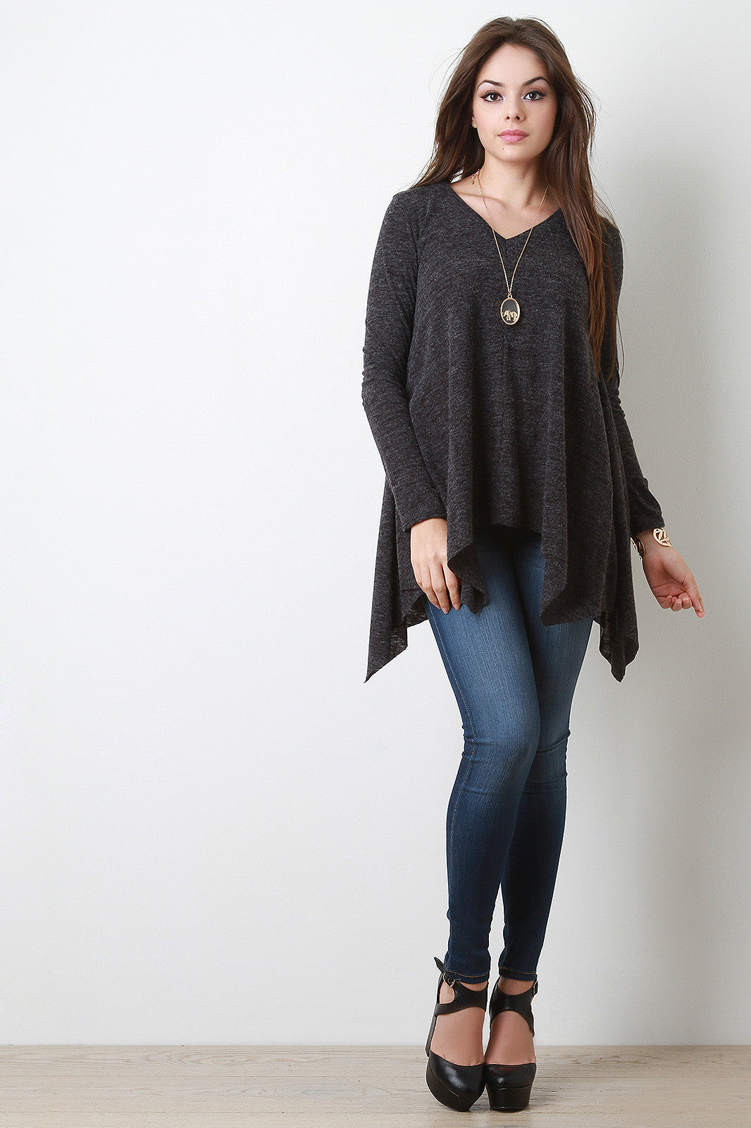 This angora-like knit sweater top features a v-neckline, long sleeves, and a trapeze hemline. Accessories sold separately. Made in U.S.A. 65% Acrylic, 25% Nylon, 10% Polyester.