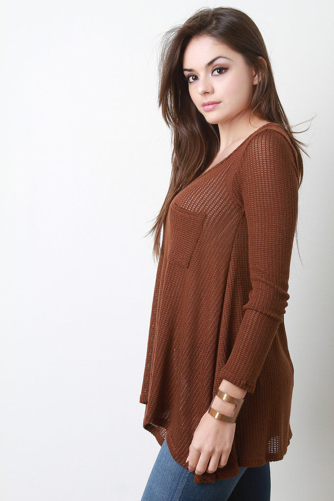 This loose knit sweater top features a scooped round neckline, long sleeves, and a trapeze hemline. Finished with a single left breast pocket. Accessories sold separately. Made in U.S.A. 64% Polyester, 34% Rayon, 2% Spandex.
