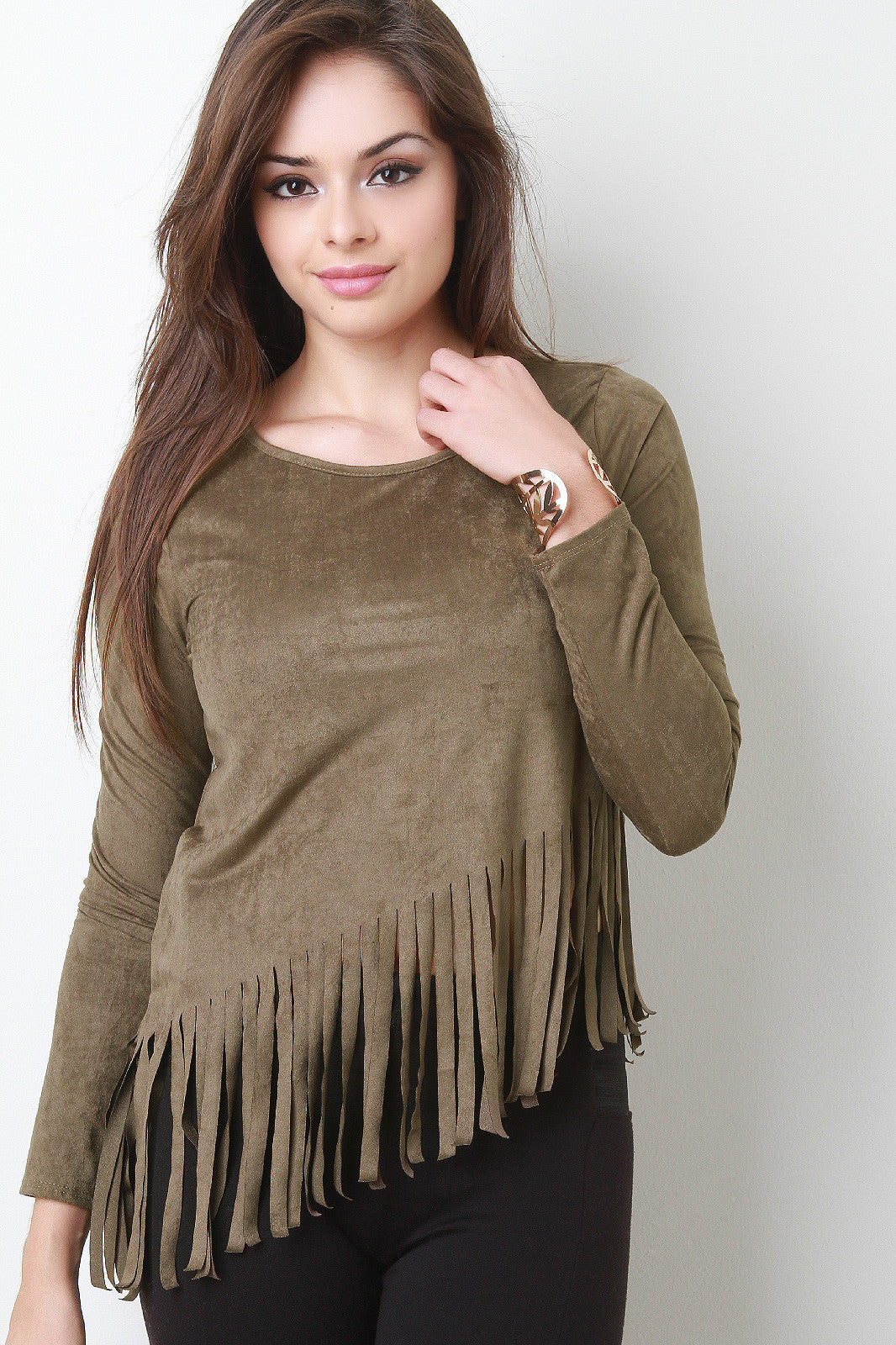 A crop top featuring a round neckline, long sleeves, and a slanted hemline with long fringe. Finished with a keyhole back. Accessories sold separately. Made in U.S.A. 90% Rayon, 10% Spandex.