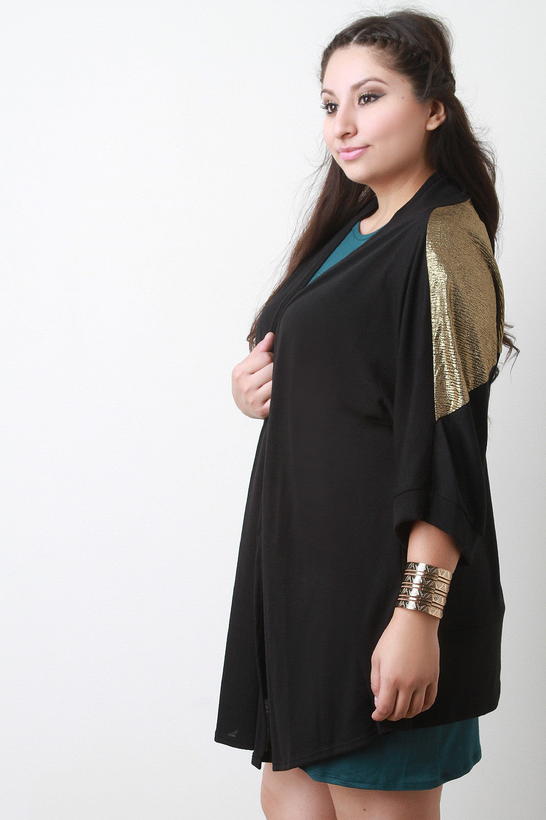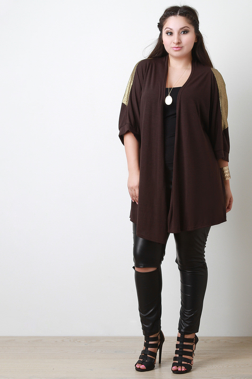 Crinkle Metallic Foil Trim Draped Open Front Cardigan