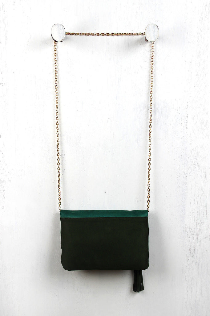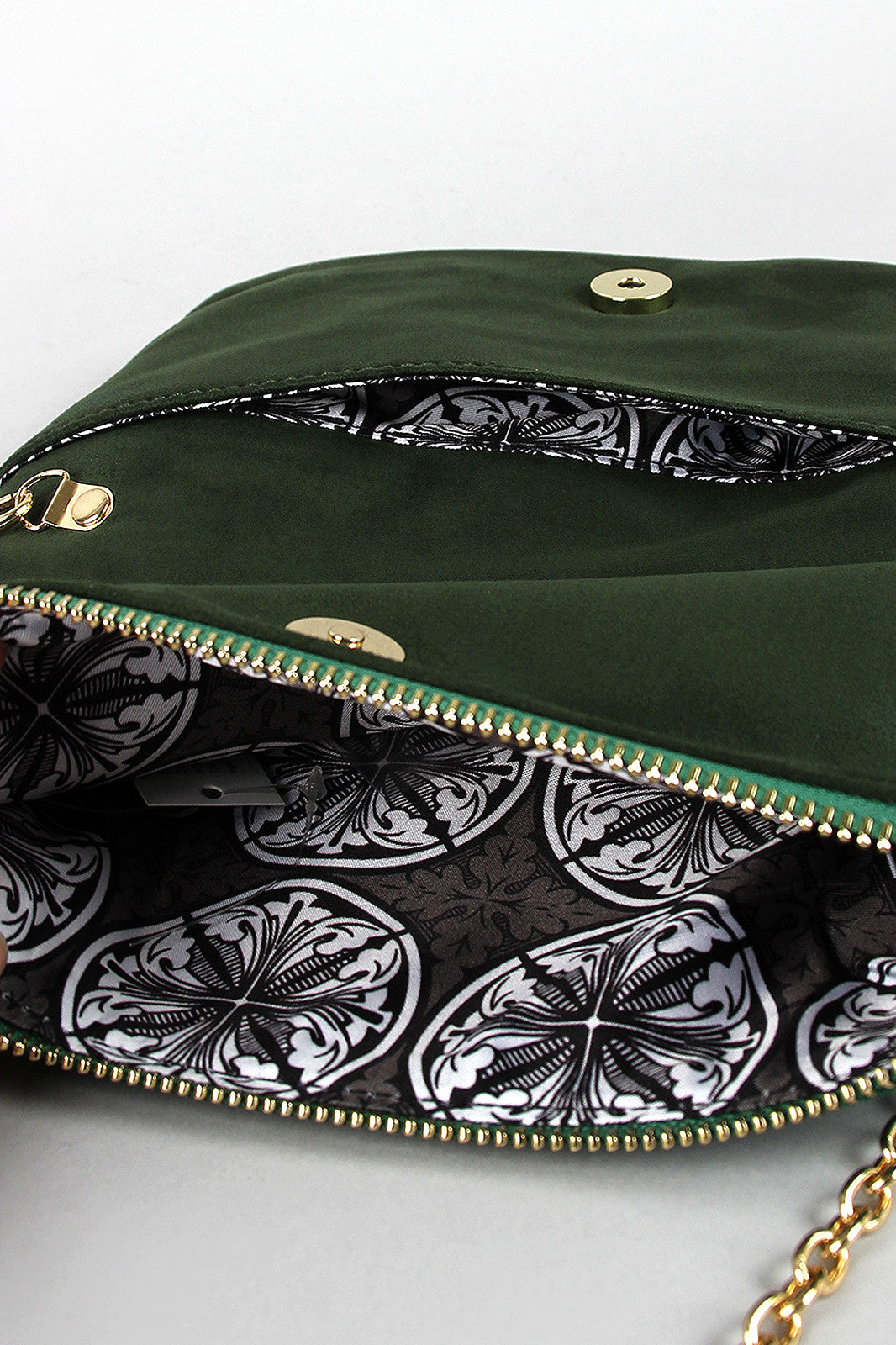 A vividly-colored fringe tassel zipper pull, and zipper pocket against the back wall. Finished with a satin medallion-patterned lining and a front slip pocket.