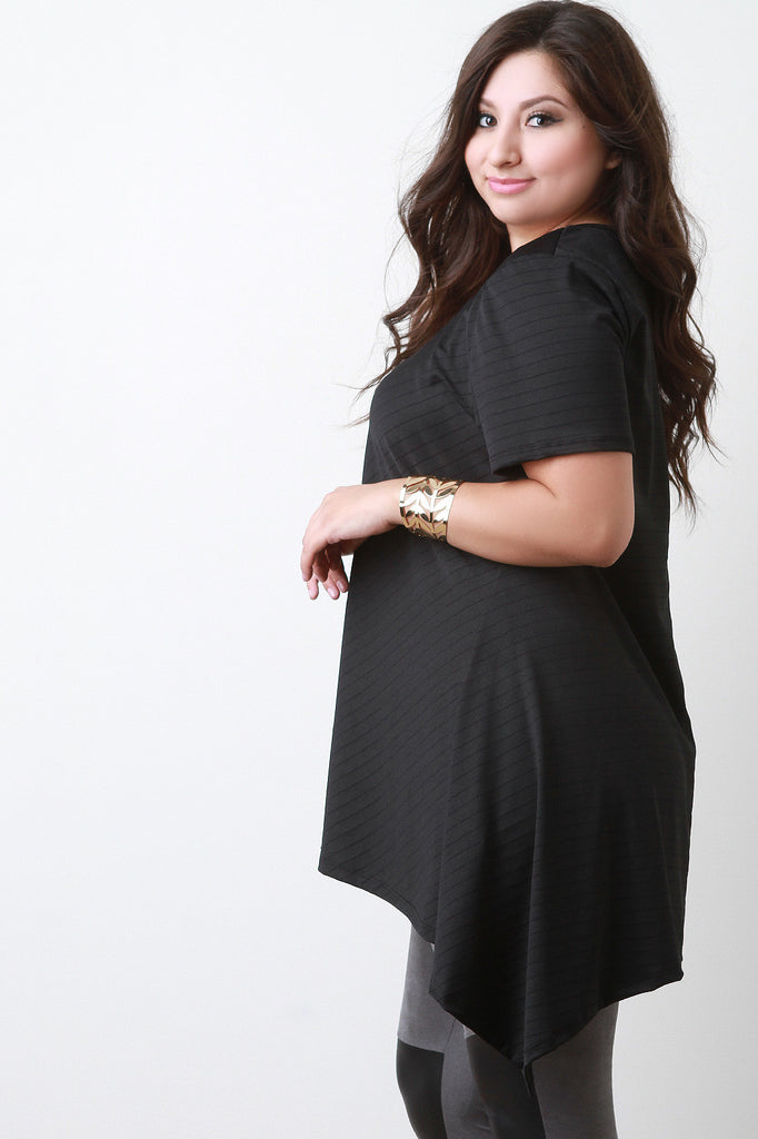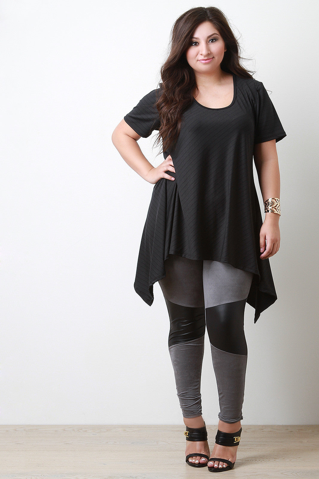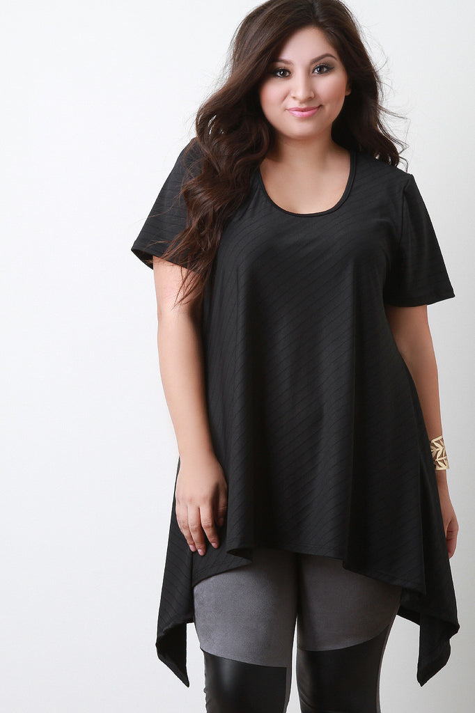 This stripe fabric, a scooped round neckline, and short sleeves. Finished with a sharkbite hemline. Accessories sold separately. Made in U.S.A. 95% Polyester, 5% Spandex.