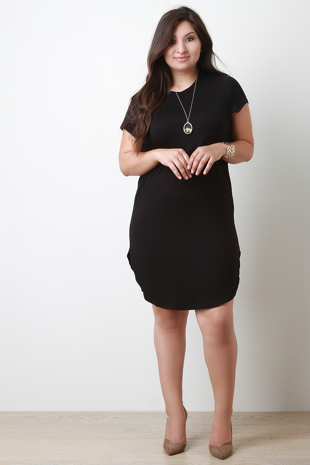 A plus size t-shirt dress with a round neckline, short sleeves, and a rounded hem with high side slits. Accessories sold separately. Made in U.S.A. 95% Rayon, 5% Spandex.