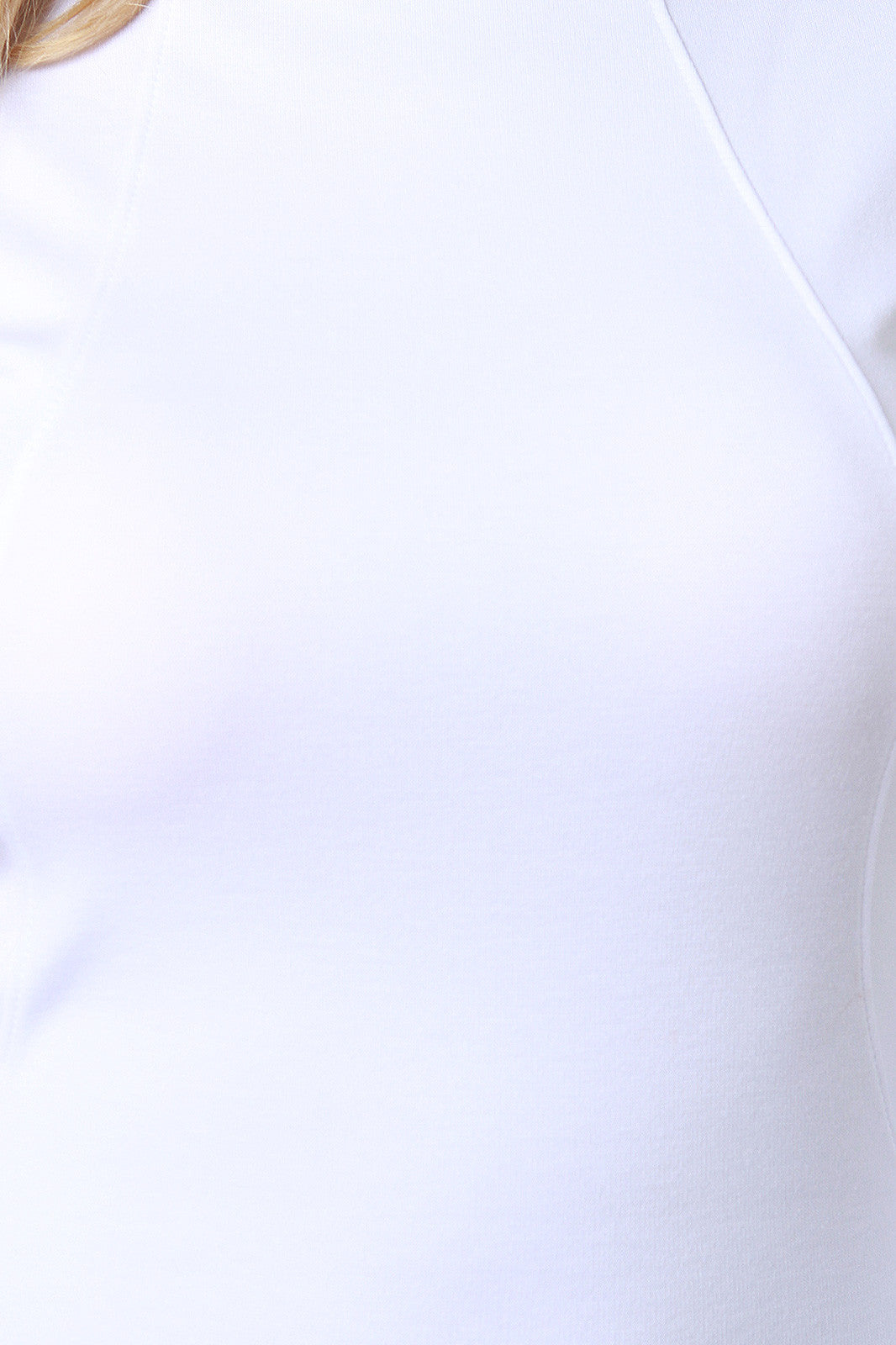 A bodycon midi dress featuring solid stretch fabric with flattering illusion seams, a short funnel neck, and long sleeves. Finished with metallic back zipper closure. Accessories sold separately. Made in U.S.A. 67% Viscose, 28% Nylon, 5% Spandex.