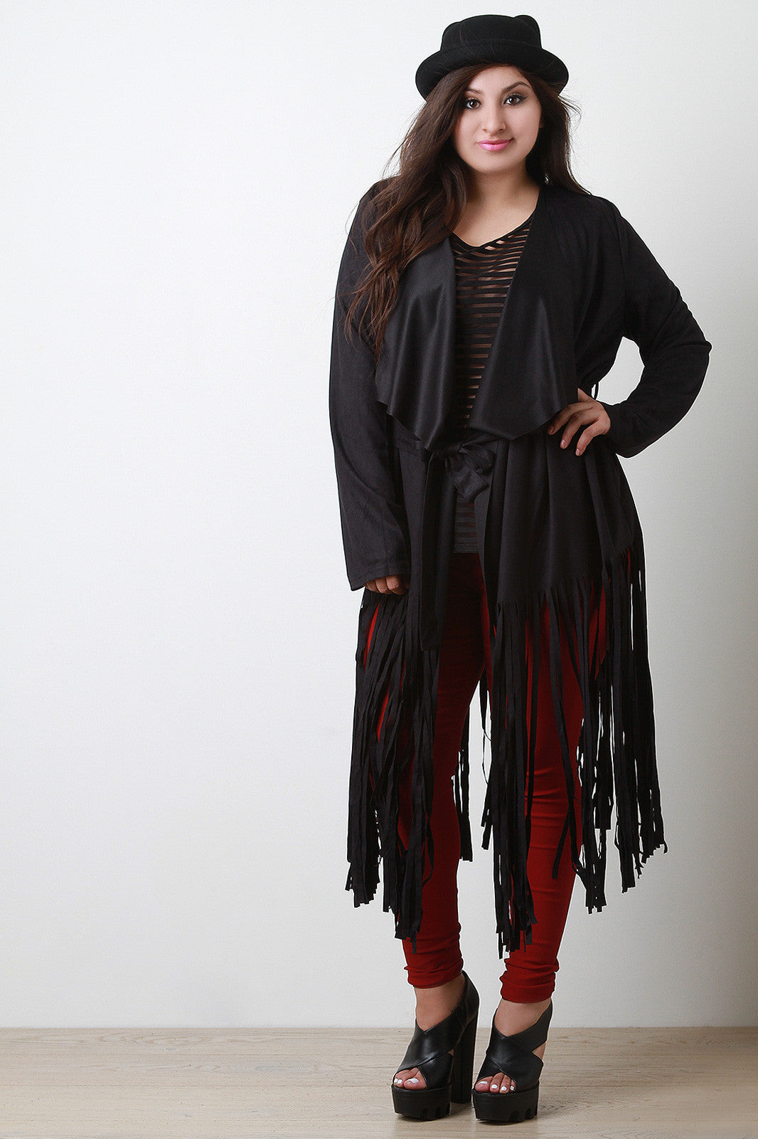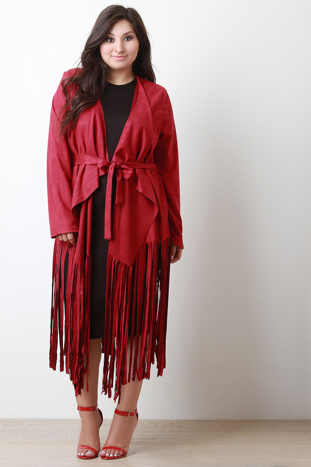 This vegan suede plus size trench coat features a draped open front design with self-tie sash, long sleeves, and fringe hemline. Accessories sold separately. 100% Polyester.