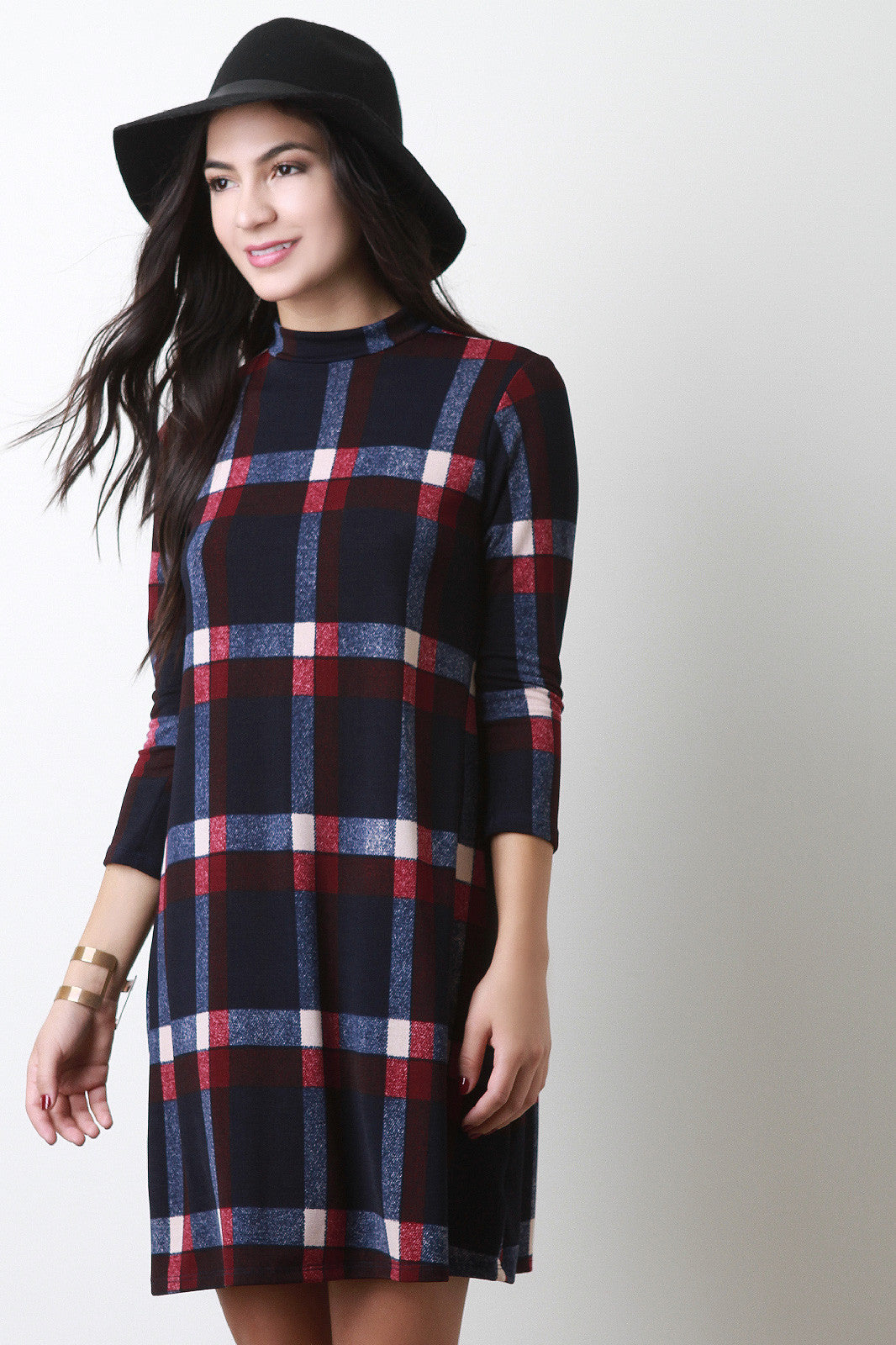 Plaid Mock Neck Shift Dress