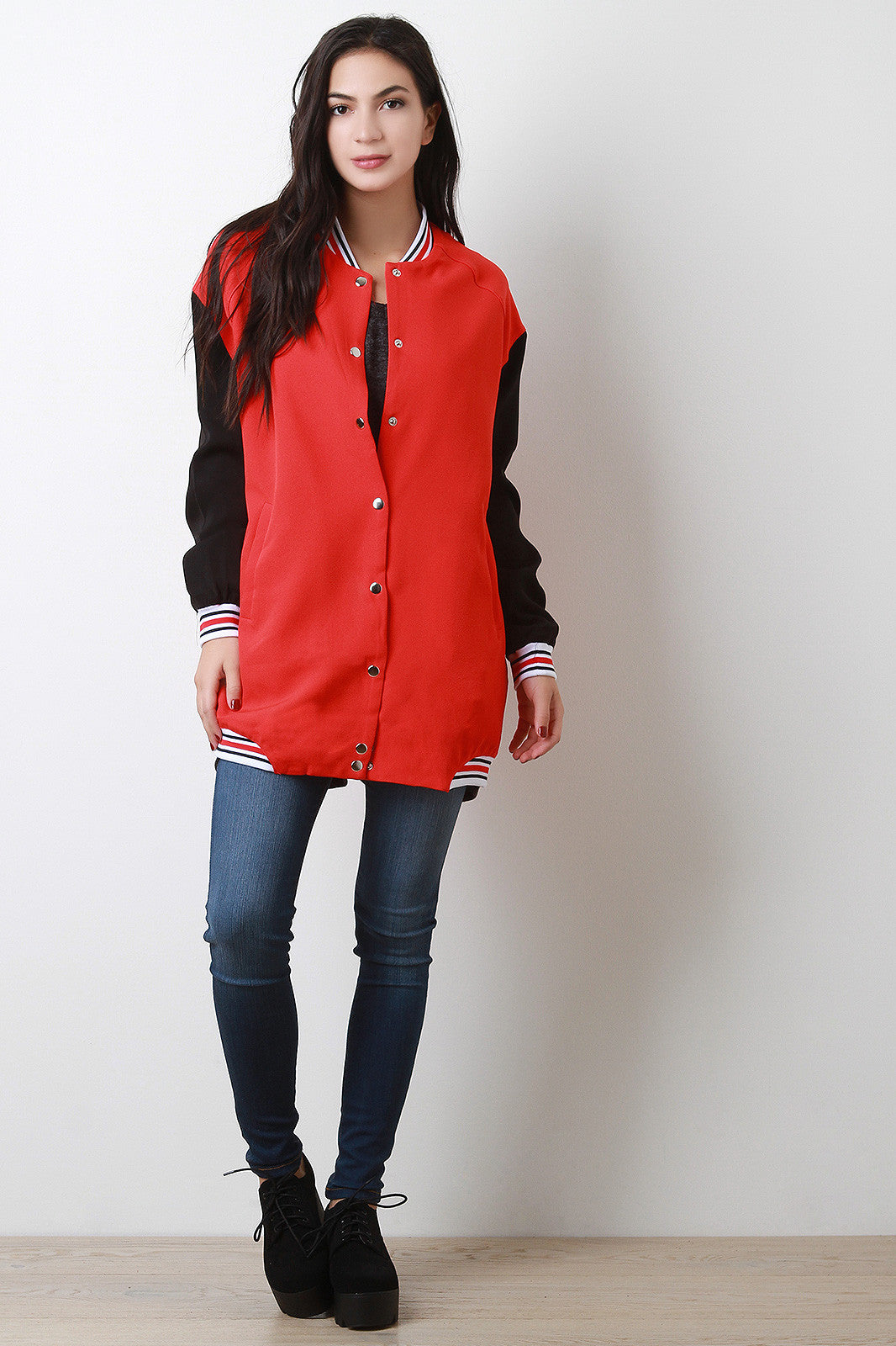 This long letterman-style jacket features a round neckline, crisp lightweight fabric, and contrast color long sleeves. Finished with a snap button-up front, elastic stripe trim, and side pockets. Accessories sold separately. Shell 1: 97% Polyester, 3% Spandex. Shell 2: 100% Cotton.