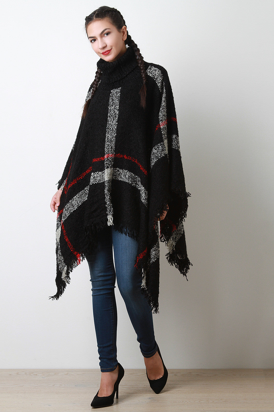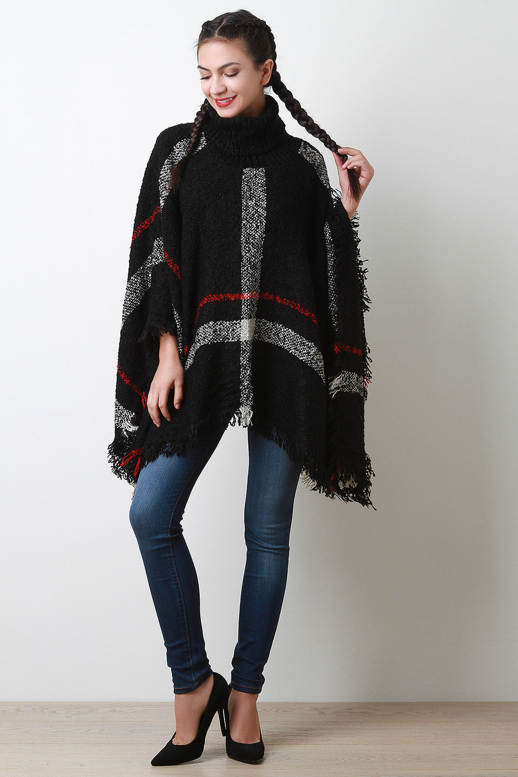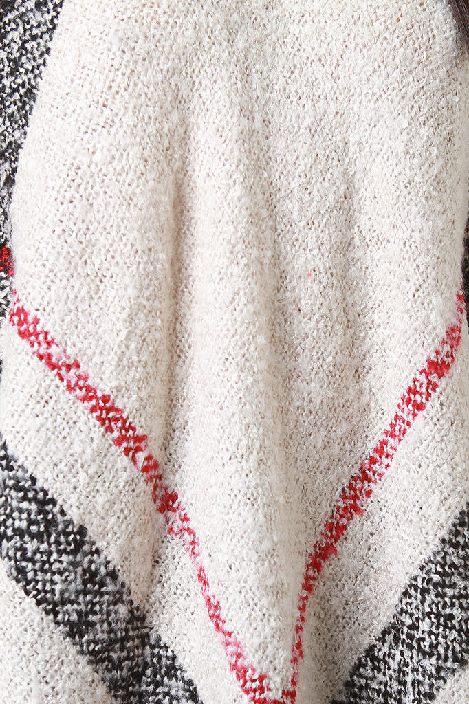 This poncho features soft textured knit, two-tone linear pattern, turtlneck, open sides, and fringed asymmetrical hemline. Accessories sold separately. 100% Acrylic.