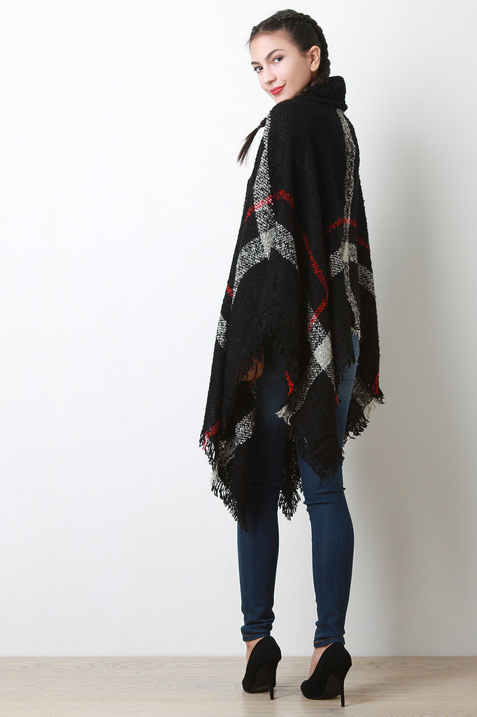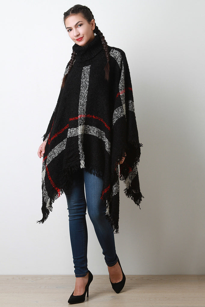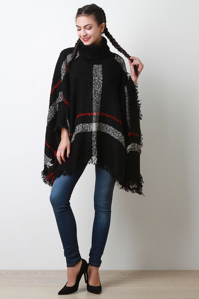 Linear Pattern Textured Knit Turtleneck Poncho