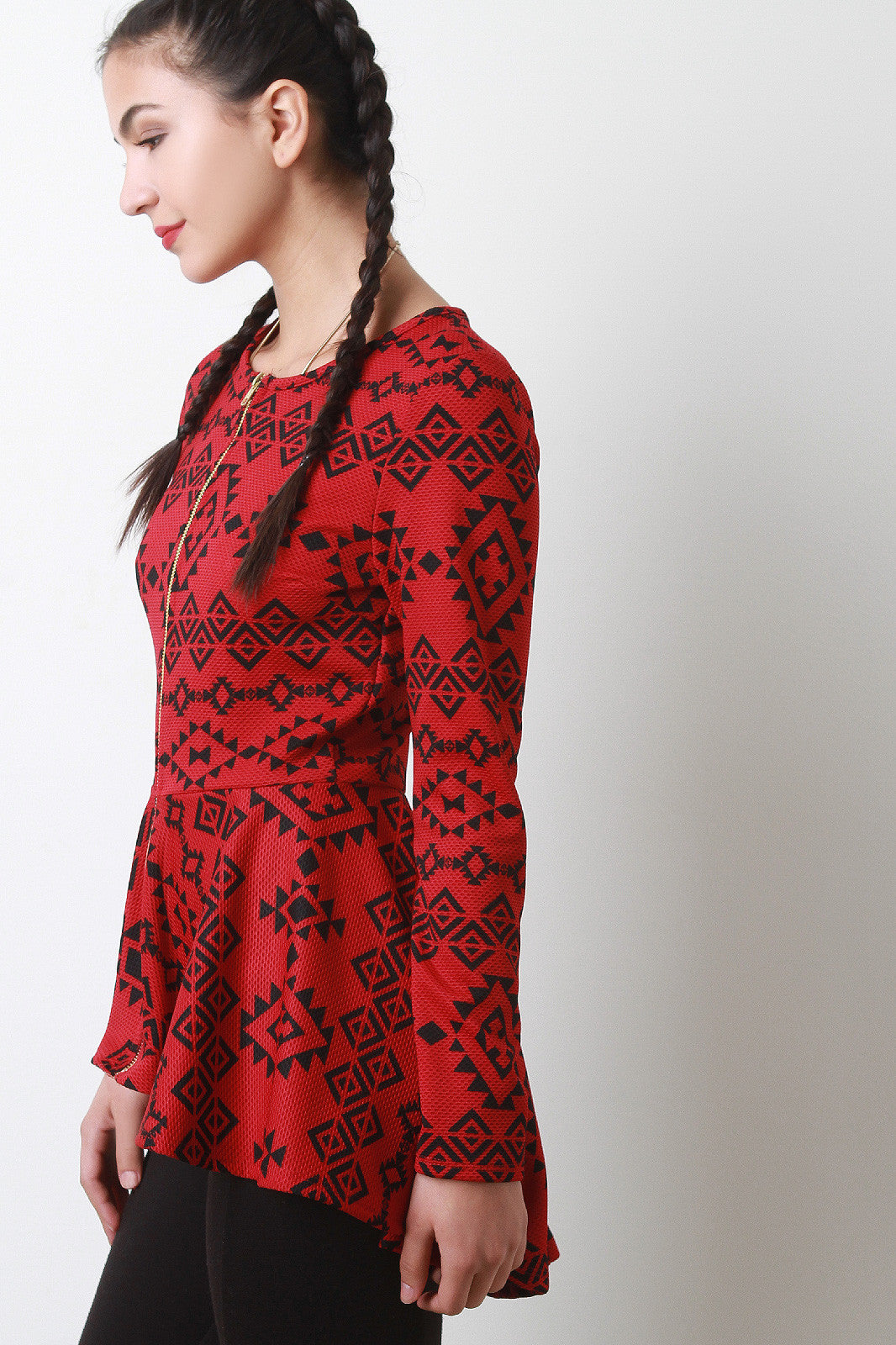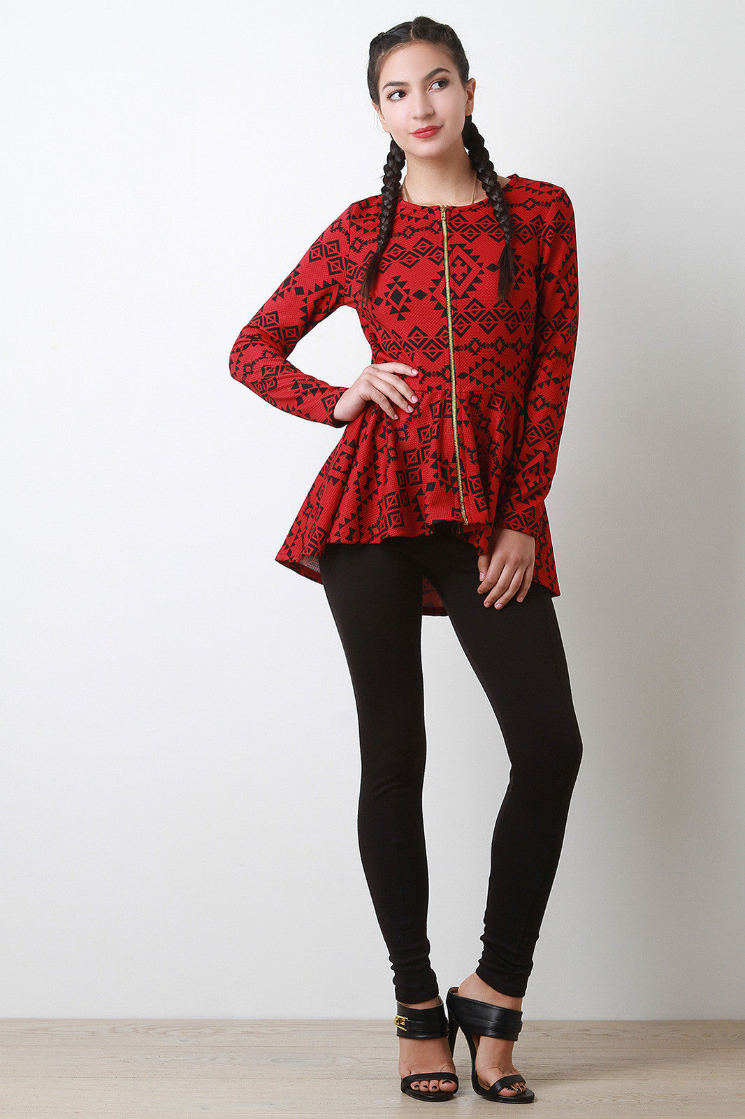 A textured peplum top featuring a tribal print throughout, a round neckline with zipper front, and long sleeves. Finished with a high-low hemline and relaxed fit. Accessories sold separately. Made in U.S.A. 96% Polyester, 4% Spandex.