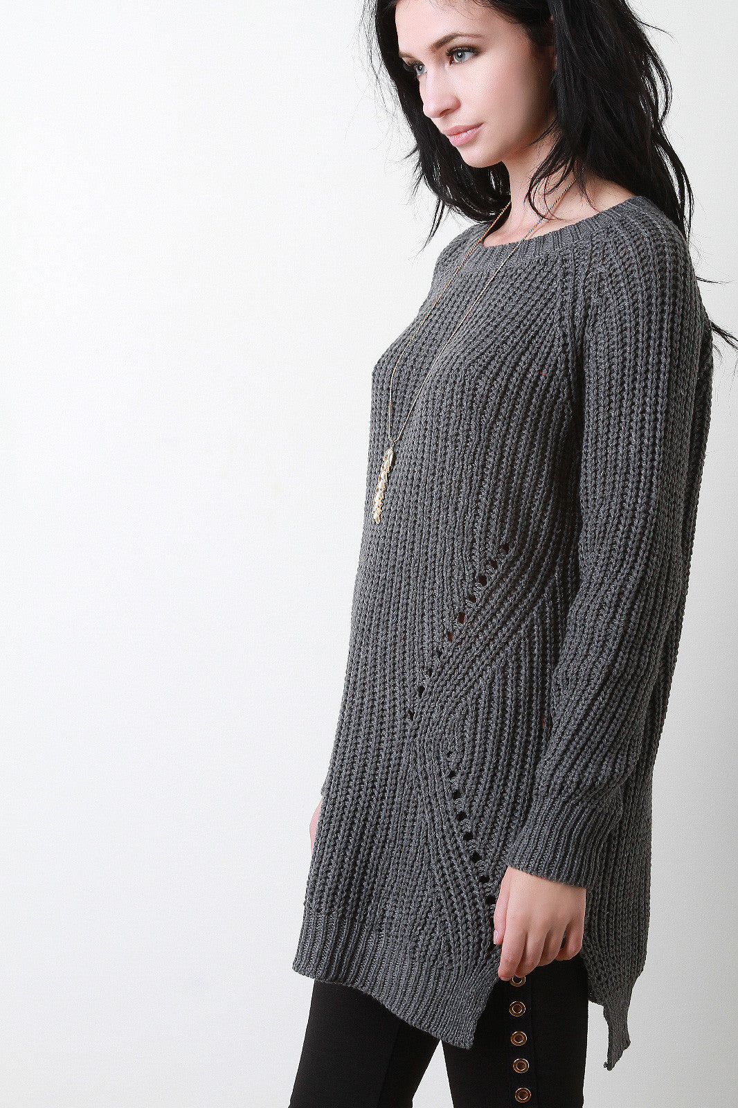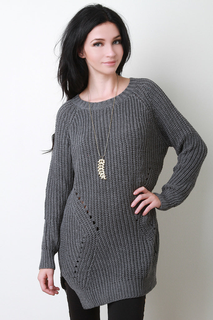 This bold ribbed knit sweater features a round neckline, long sleeves, longline design, sculpture pattern at hip, and vent slits at sides. Accessories sold separately. Made in U.S.A. 55% Cotton, 45% Acrylic.