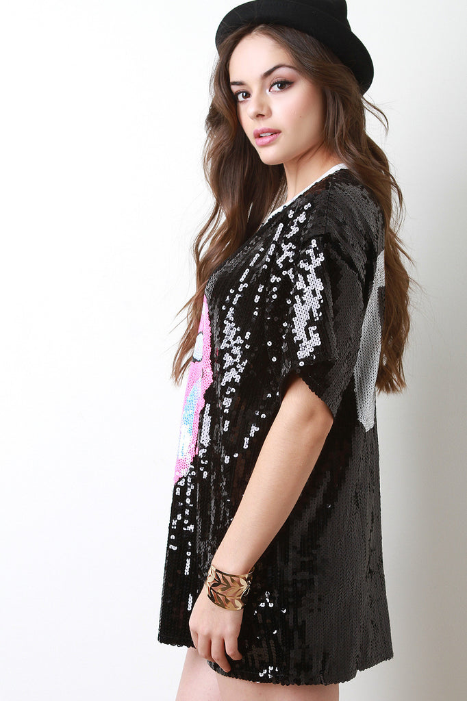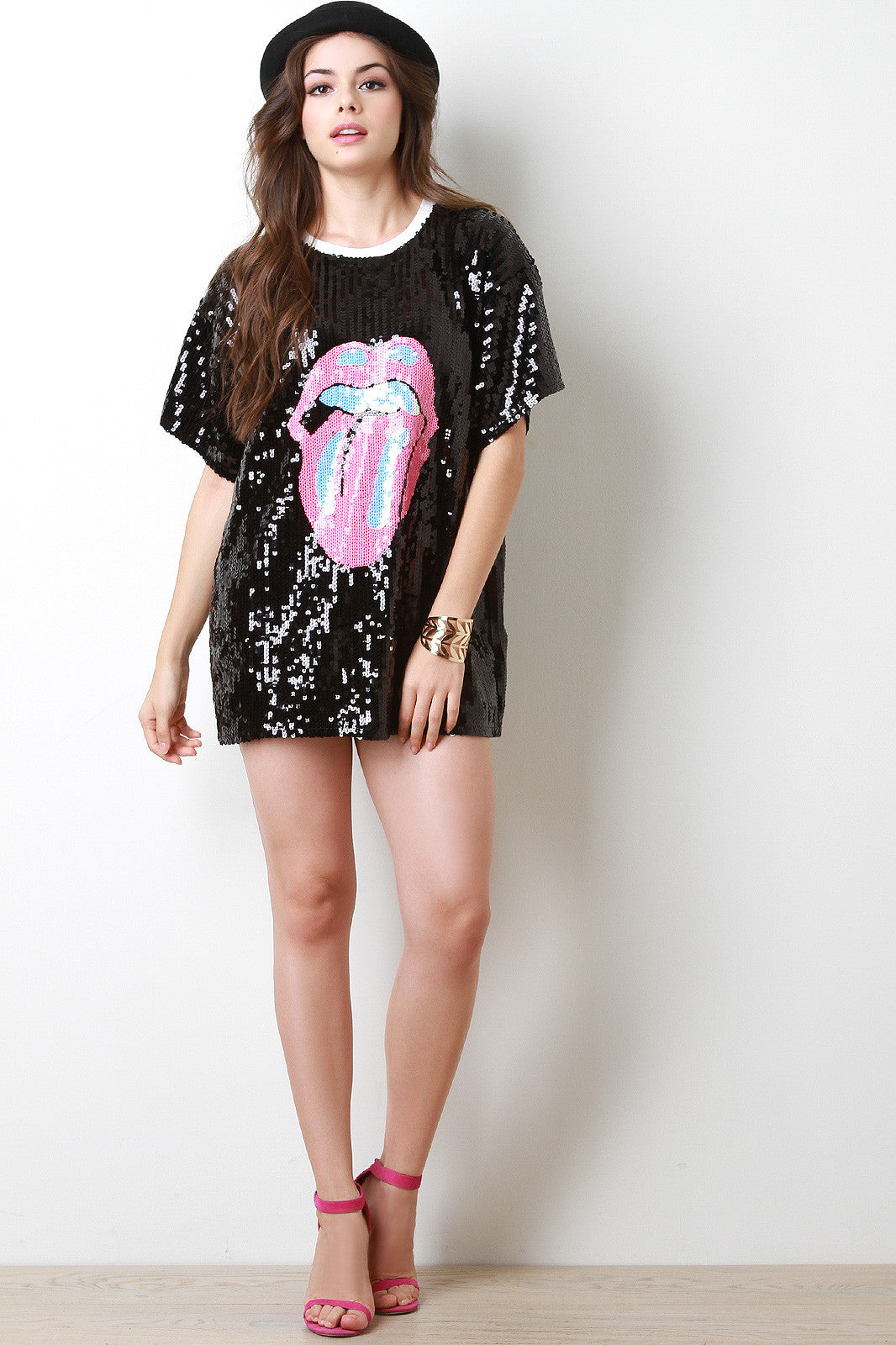 This shift dress features sequined throughout, pink lips and tongue design at front, double zeros at back, contrasting round neckline, short sleeves, complete with lining. Accessories sold separately. 100% Polyester.