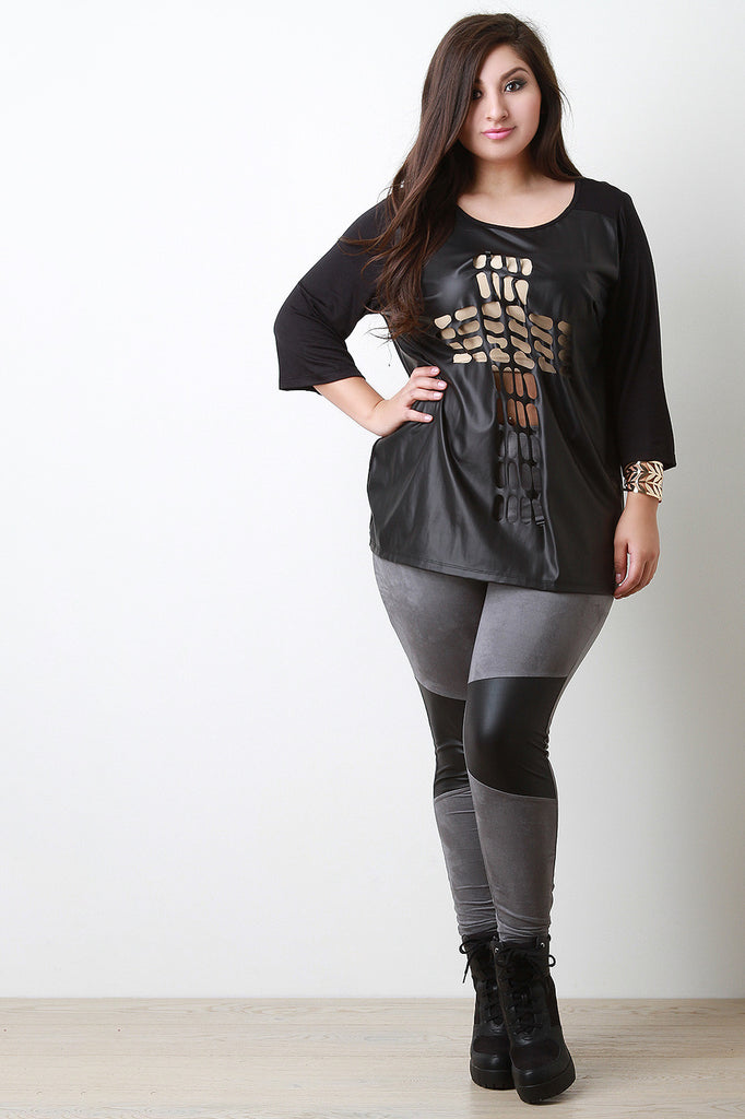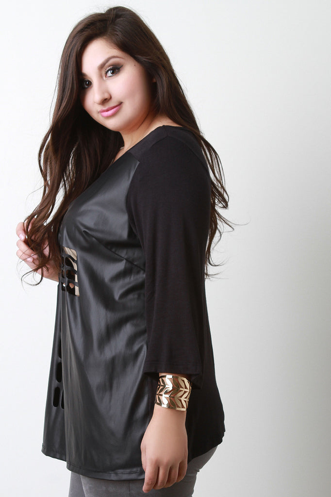 This top features vegan leather on the front section of the shirt, in a baseball tee design, along with a see-through cross cut-out. The sleeves are three-quarters in length. Accessories sold separately. Made in U.S.A. 96% Polyester, 4% Spandex.
