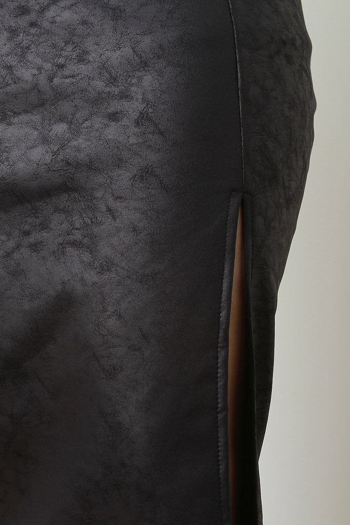 This plus size midi skirt features a distressed knit fabrication with a high, elastic waist. The left side has a slit starting from the mid-thigh down to the hem of the skirt. Accessories sold separately. Made in U.S.A. 95% Polyester, 5% Spandex.