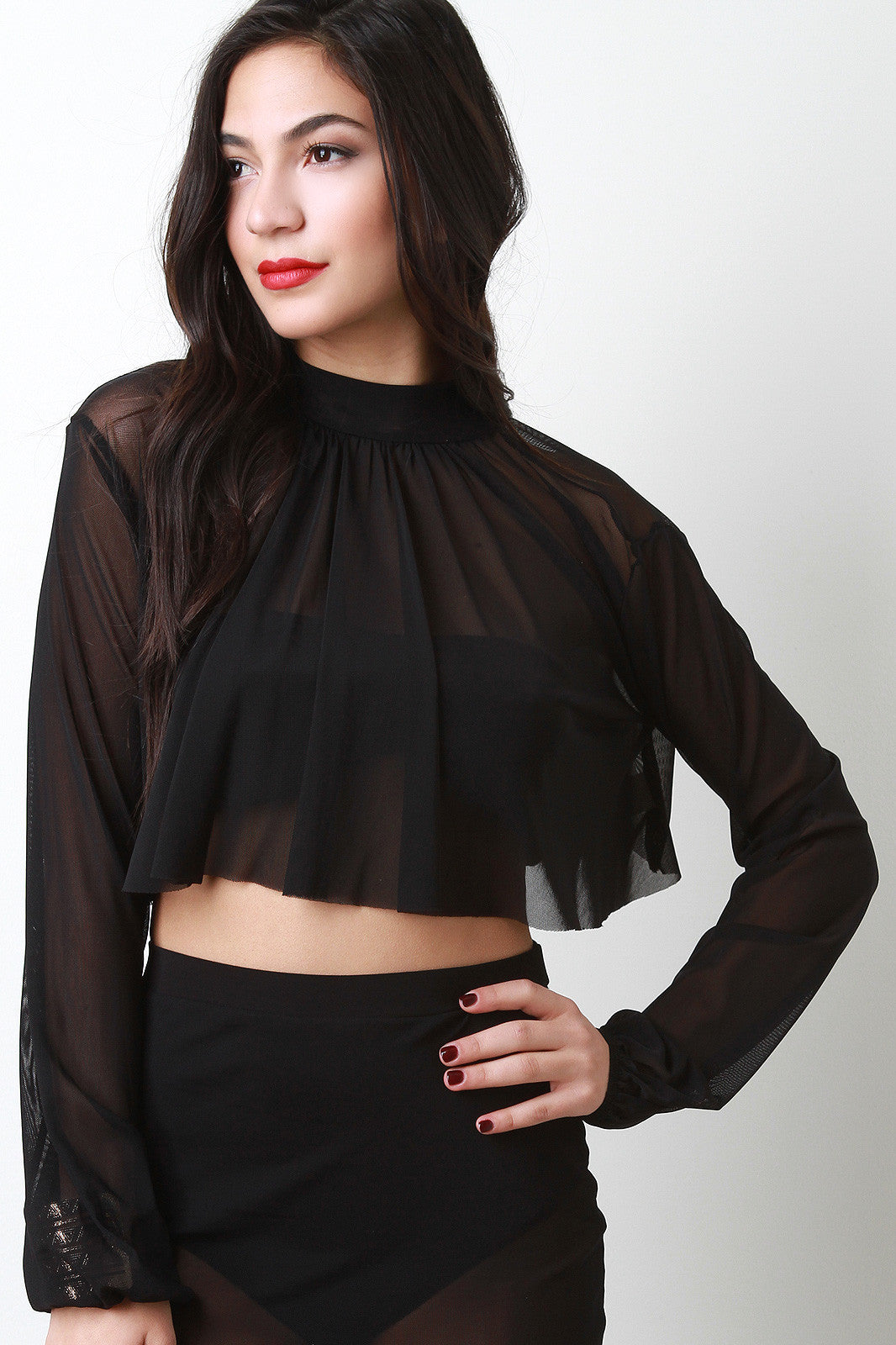 This semi-sheer mesh top features a cape design, mock neckline with a self-tie bow at nape to an open back, long sleeves, and cropped hemline. Accessories sold separately. Made in U.S.A. 100% Polyester.