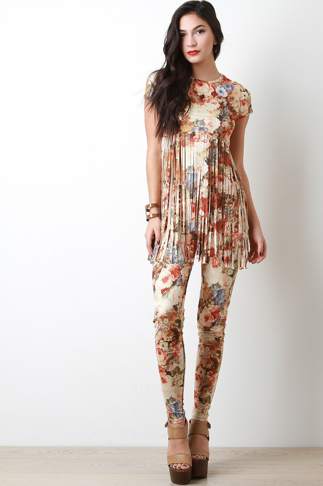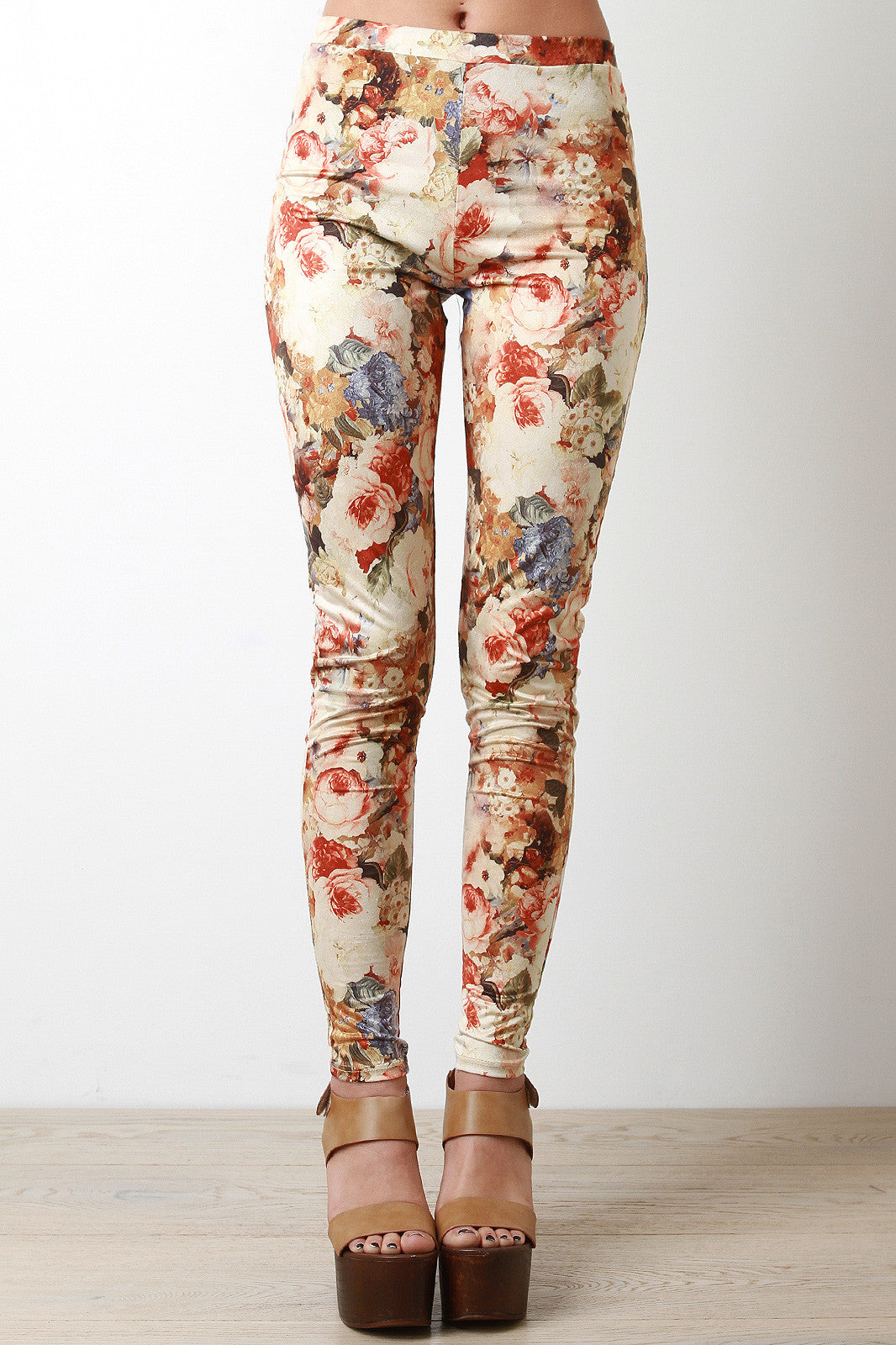 These tight legging pants features a high rise, elasticized waist, stretchy taper cut fit, and floral pattern print. Accessories sold separately. Made in U.S.A. 95% Polyester, 5% Spandex.