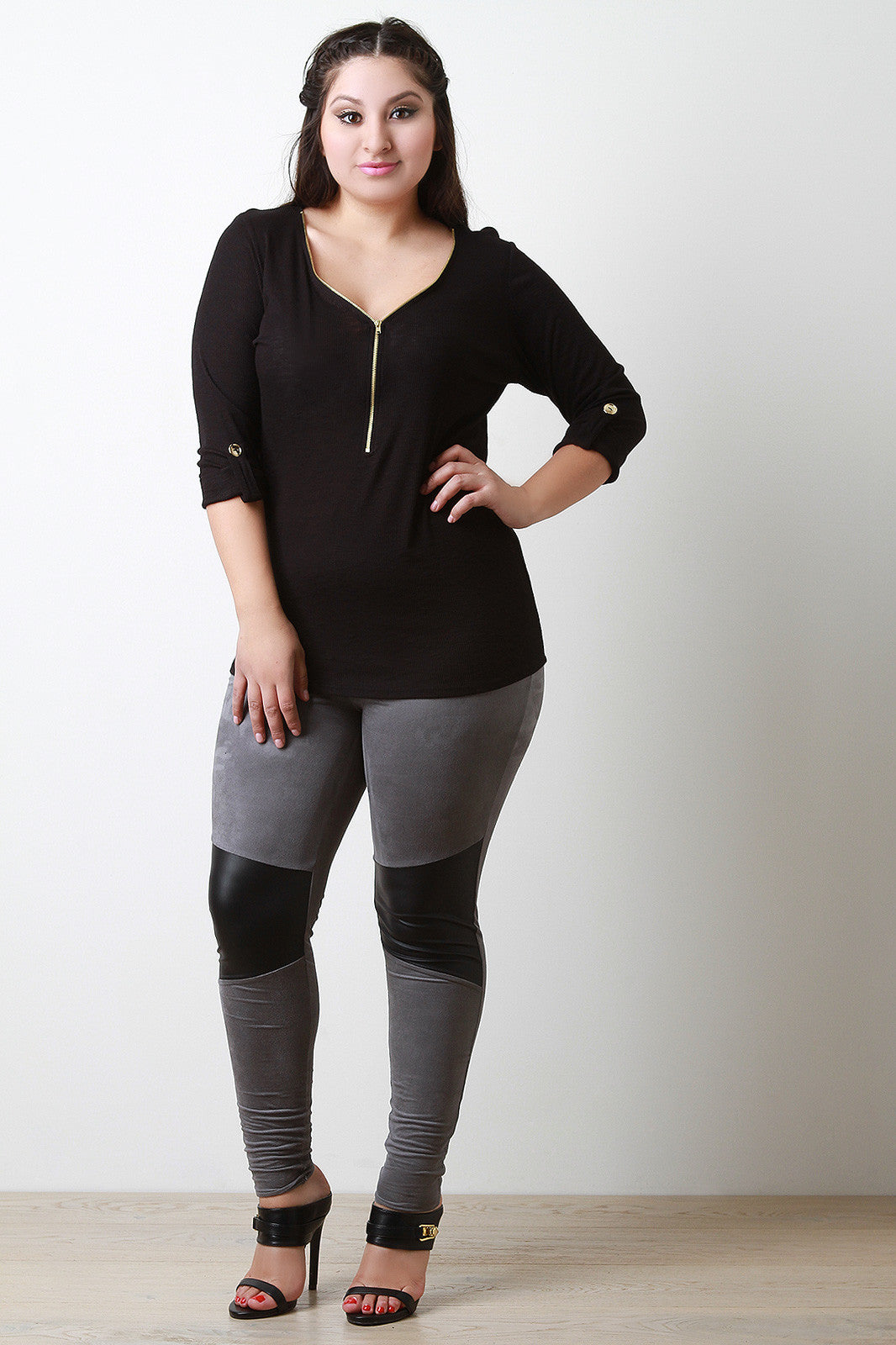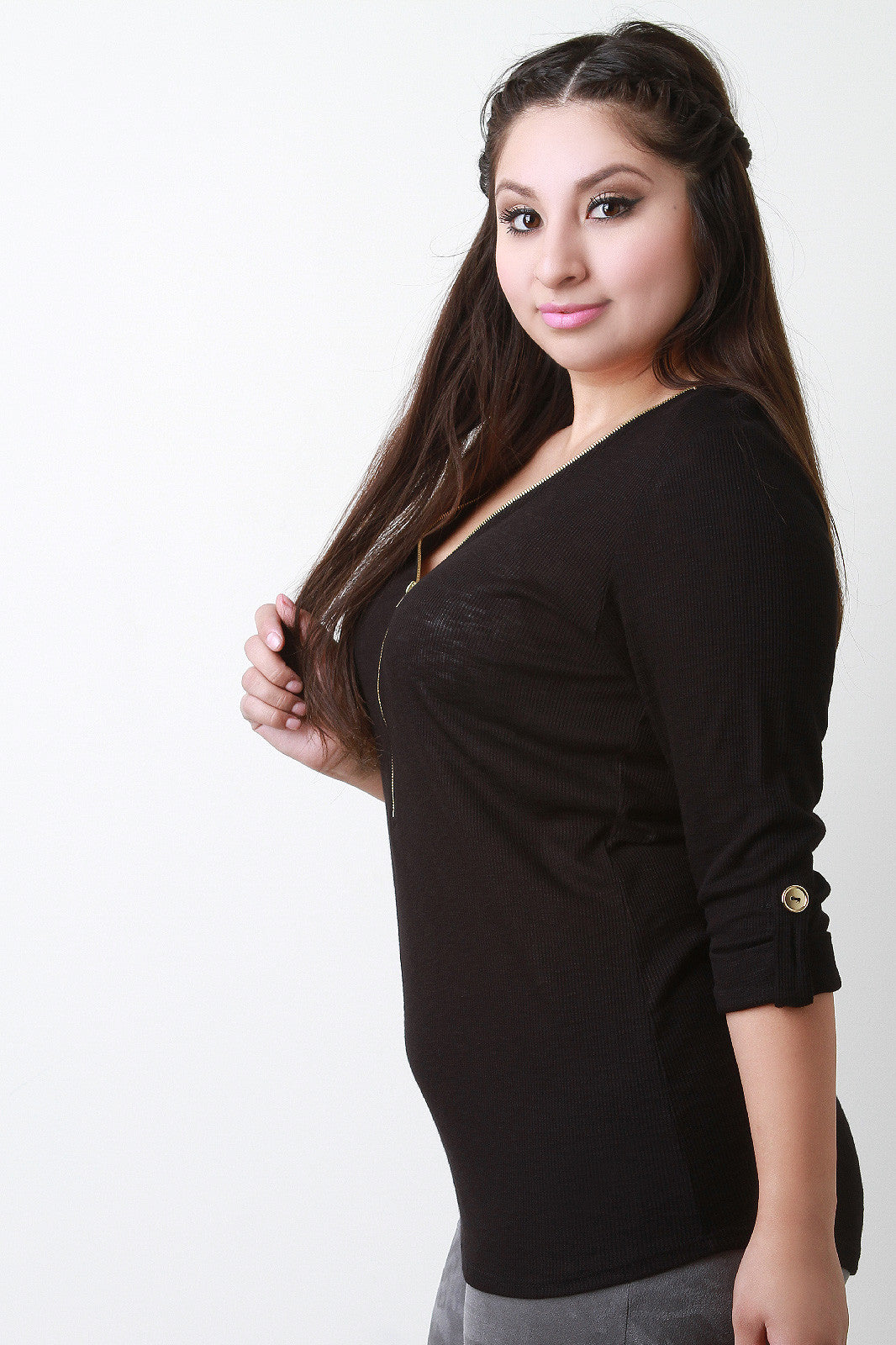 This plus size top features a ribbed knit fabrication, zipper constructed v-neckline, and quarter-length sleeves with button-tab accent. Accessories sold separately. Made in U.S.A. 97% Rayon, 3% Spandex.