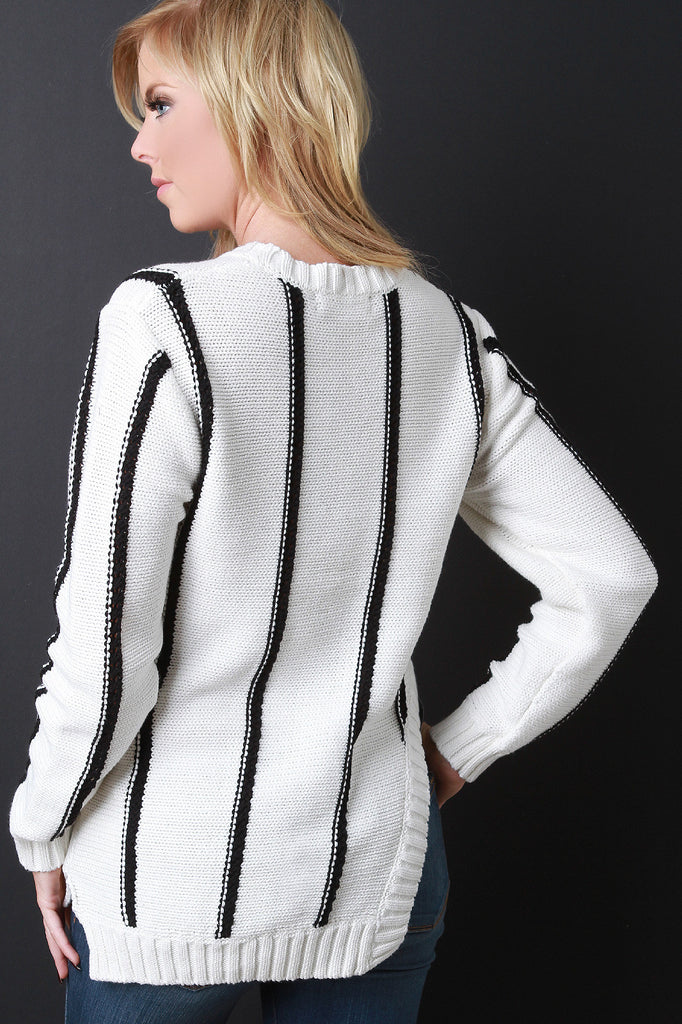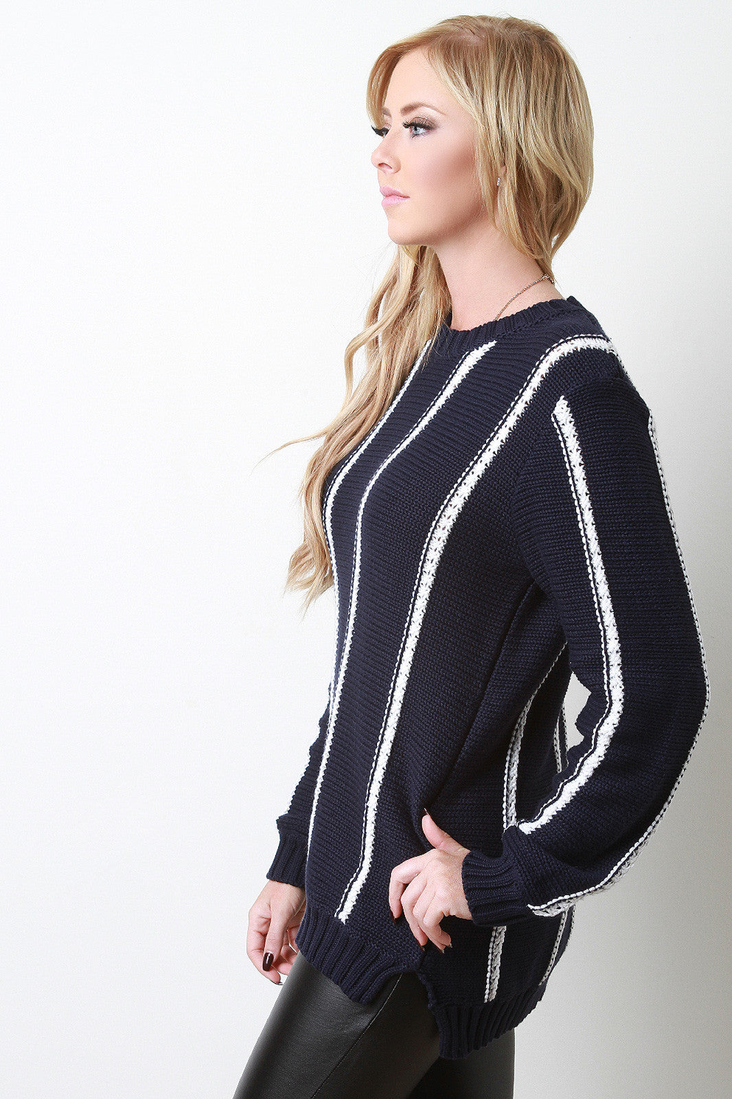 A vertically sweater featuring a round neckline, long sleeves, and an asymmetrical opening at the side of the hem. Finished with ribbed knit cuffs and hems. Accessories sold separately. 100% Cotton.