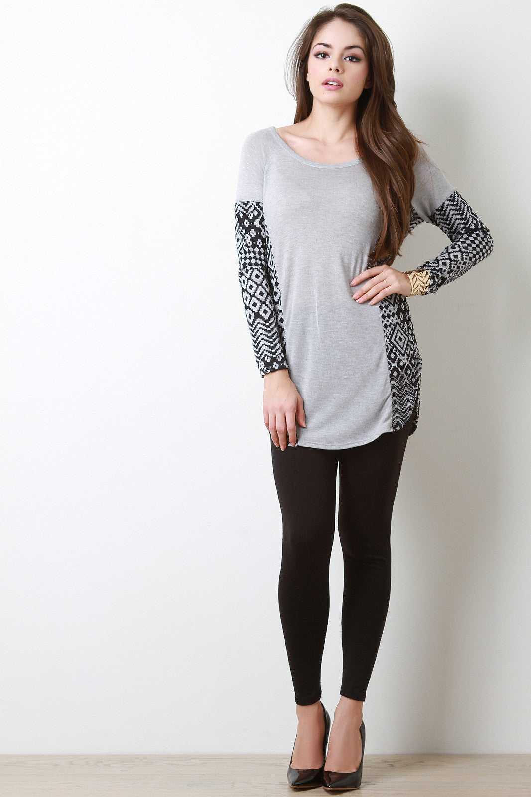 This top features soft solid knit, contrast southwestern pattern panels, dropped shoulders, long sleeves, and side slits. Accessories sold separately. Made in U.S.A. Self: 63% Polyester, 34% Rayon, 3% Spandex.